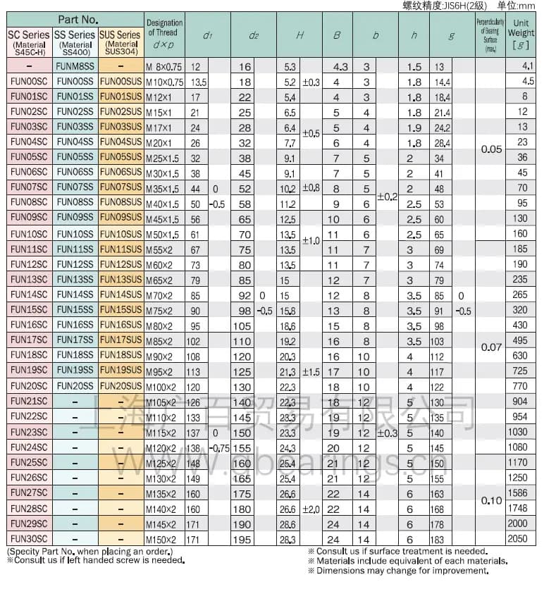 尺寸 | M 8~M100 (SS系列) M10~M150(SC系列) M10~M100(SUS系列) ※螺距:精密螺紋 |