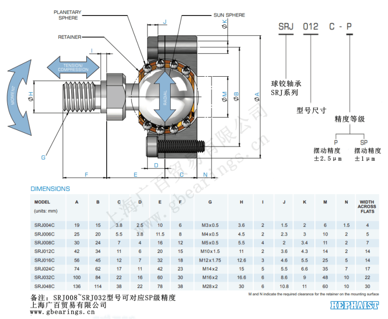 SRJ008C-SP 日本HEPHAIST球鉸軸承 用于自由度平臺(tái)