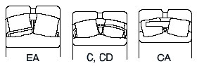 調心滾子軸承,如圖所示,有高負荷容量設計的EA型,C型,CD型,CA型。設計上, EA型,C型,CD型 為沖壓保持架, CA型為銅合金車制保持架。EA 型軸承具有高負荷容量,低轉矩的特長。